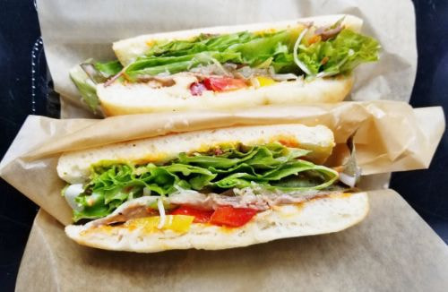 国内産のローストビーフと富士町で育った野菜たちをサンドし三種類のドレッシングで仕上げています。