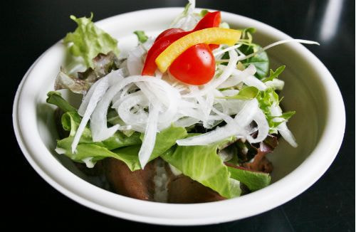 白いご飯の上に国産牛のローストビーフとたっぷりの野菜、デミソースとマヨネーズ、3種のドレッシングで仕上げてます